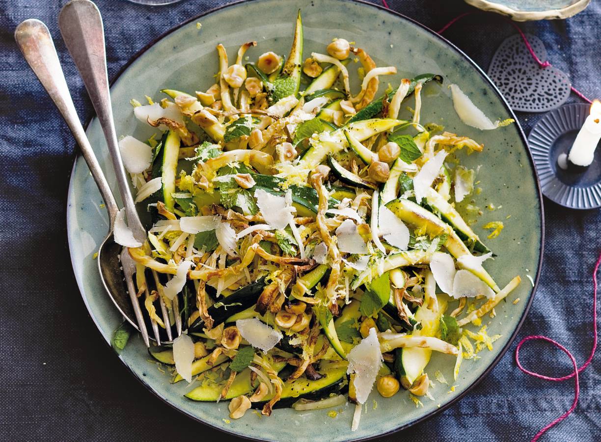 Rasp de gele schil van de schoongeboende citroen en pers de vrucht uit. Voeg het rasp en naar smaak citroensap toe aan de salade. Scheur de blaadjes van de munt in stukken en meng door de salade. Bestrooi met de hazelnoten en geschaafde Parmezaanse kaas.
