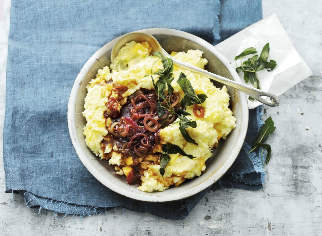 Snijd de kaas in blokjes van 1/2 cm (brunoise). Giet de aardappelen en pastinaak af, maar vang 100 ml kookvocht (per 4 pers.) op. Stamp de aardappelen met de pastinaak, het kookvocht en de crème fraîche tot een smeuïge puree. Schep de kaas erdoor en breng op smaak met peper en eventueel zout. Serveer de stamppot met de salie en uienjus.