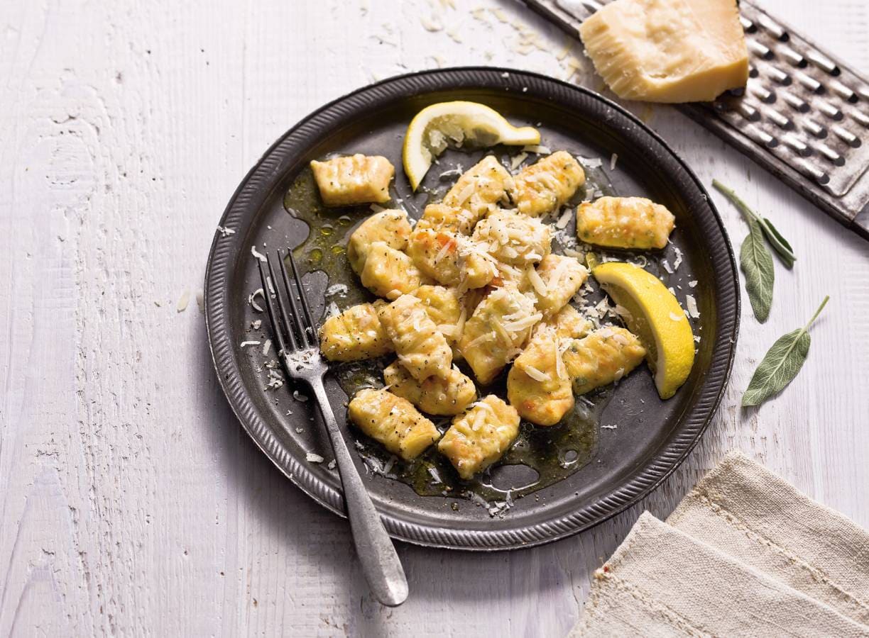 Pers de helft van de citroen uit, snijd de rest in partjes. Verhit de boter in een hapjespan, voeg de gnocchi en het citroensap (1 el per 30 g boter) toe en schep om. Verwarm 1 min. Bestrooi met de rest van de geraspte kaas en serveer de citroenpartjes erbij.