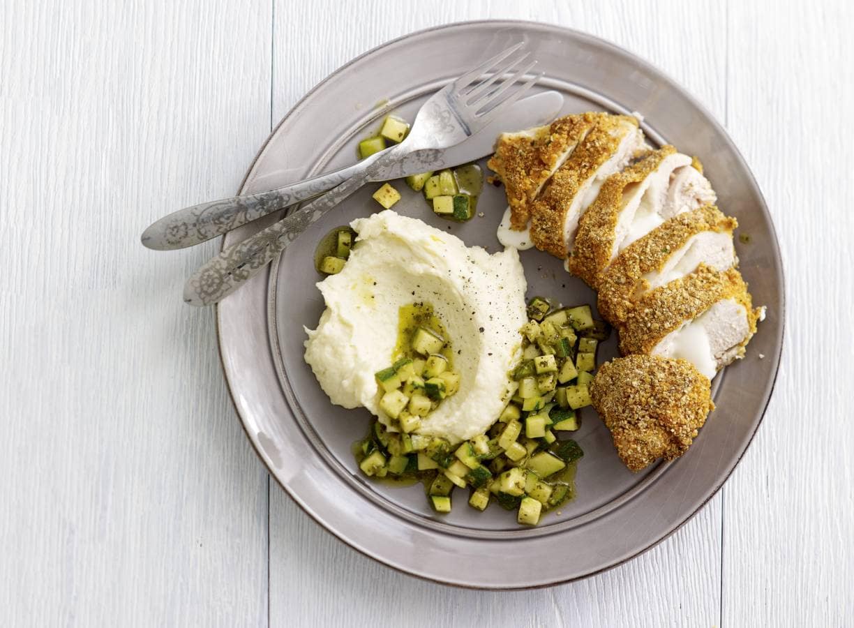 Schep de courgette in een schaal om met de pesto en peper en laat iets afkoelen. Schep de puree en de lauwwarme courgettesalade op borden. Verwijder de prikkers, snijd de kipfilet in plakken en verdeel over de borden.