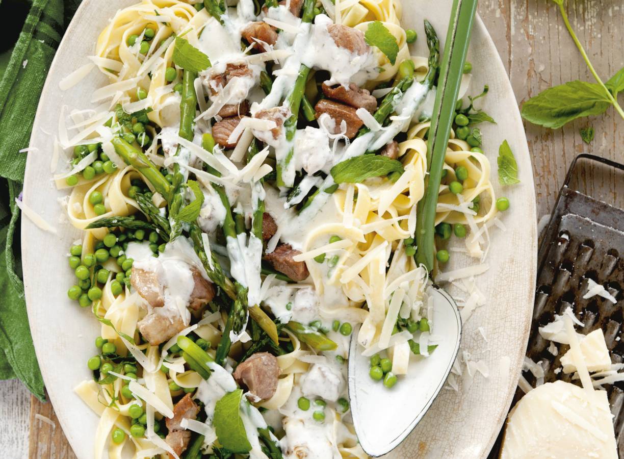 Snijd ondertussen de blaadjes van de munt fijn. Meng de pasta met de erwten en bestrooi met 1/3 van de munt. Schaaf de kaas. Strooi de rest van de munt en de kaas over het kalkoenmengsel en serveer.
