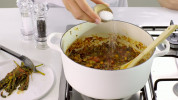 Laat op laag vuur zonder deksel 30 min. zachtjes koken. Roer regelmatig. Verwijder de kruiden.
