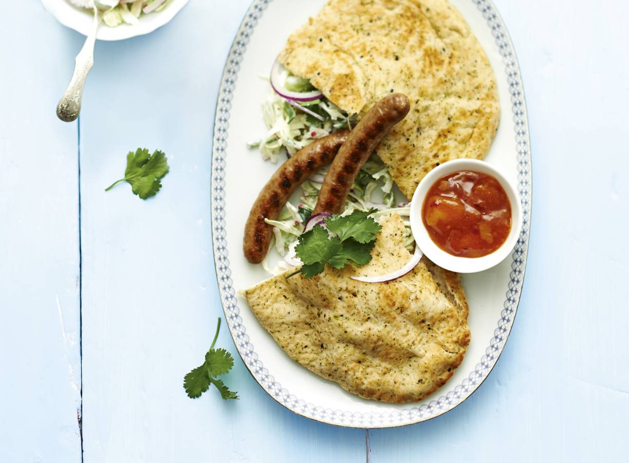 2. Verhit de grillpan. Gril de worstjes in 8 min. bruin en gaar. Rooster ondertussen het naanbrood in een koekenpan zonder boter of olie tot het warm en knapperig is.