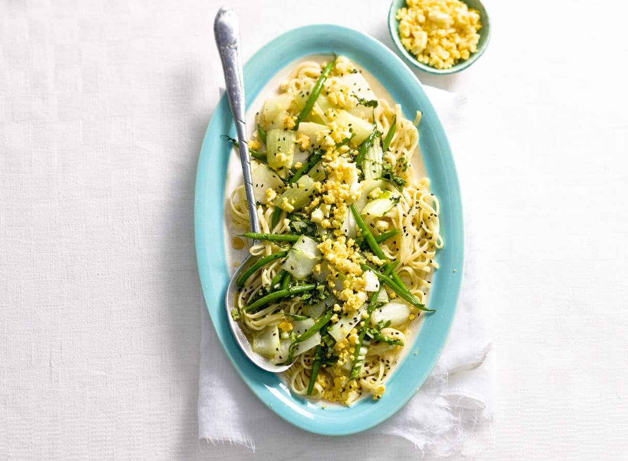 Bereid de mie volgens de aanwijzingen op de verpakking en spoel af onder koud stromend water. Kook ondertussen de eieren in 8 min. hard. Laat schrikken, pel en prak fijn. Snijd de paksoistelen in de breedte in 3 stukken, snijd het groen fijn. Verwijder de steelaanzet van de haricots verts. Schil en rasp de gember.