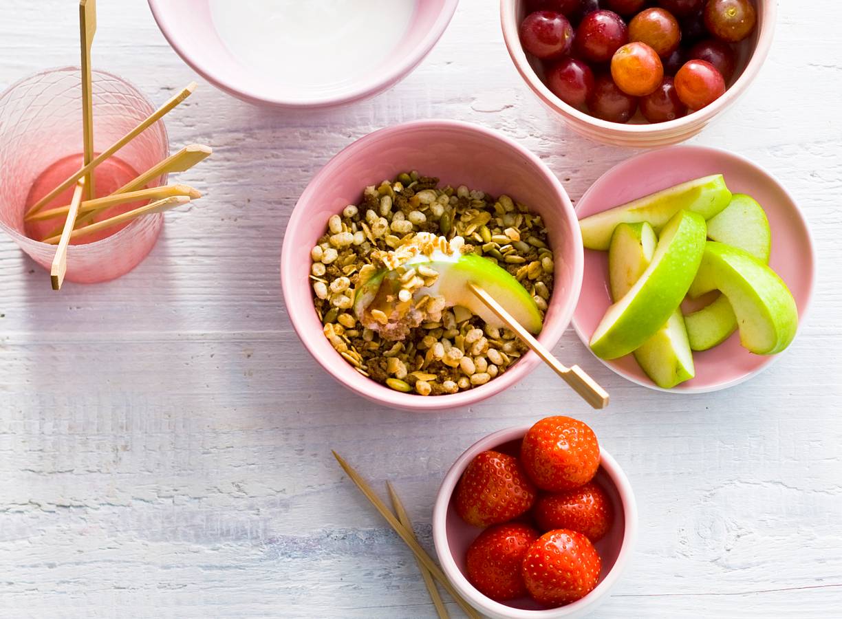 Prik een cocktailprikker in een stuk fruit naar keuze, dip in de yoghurt en vervolgens in de ontbijtgranen.