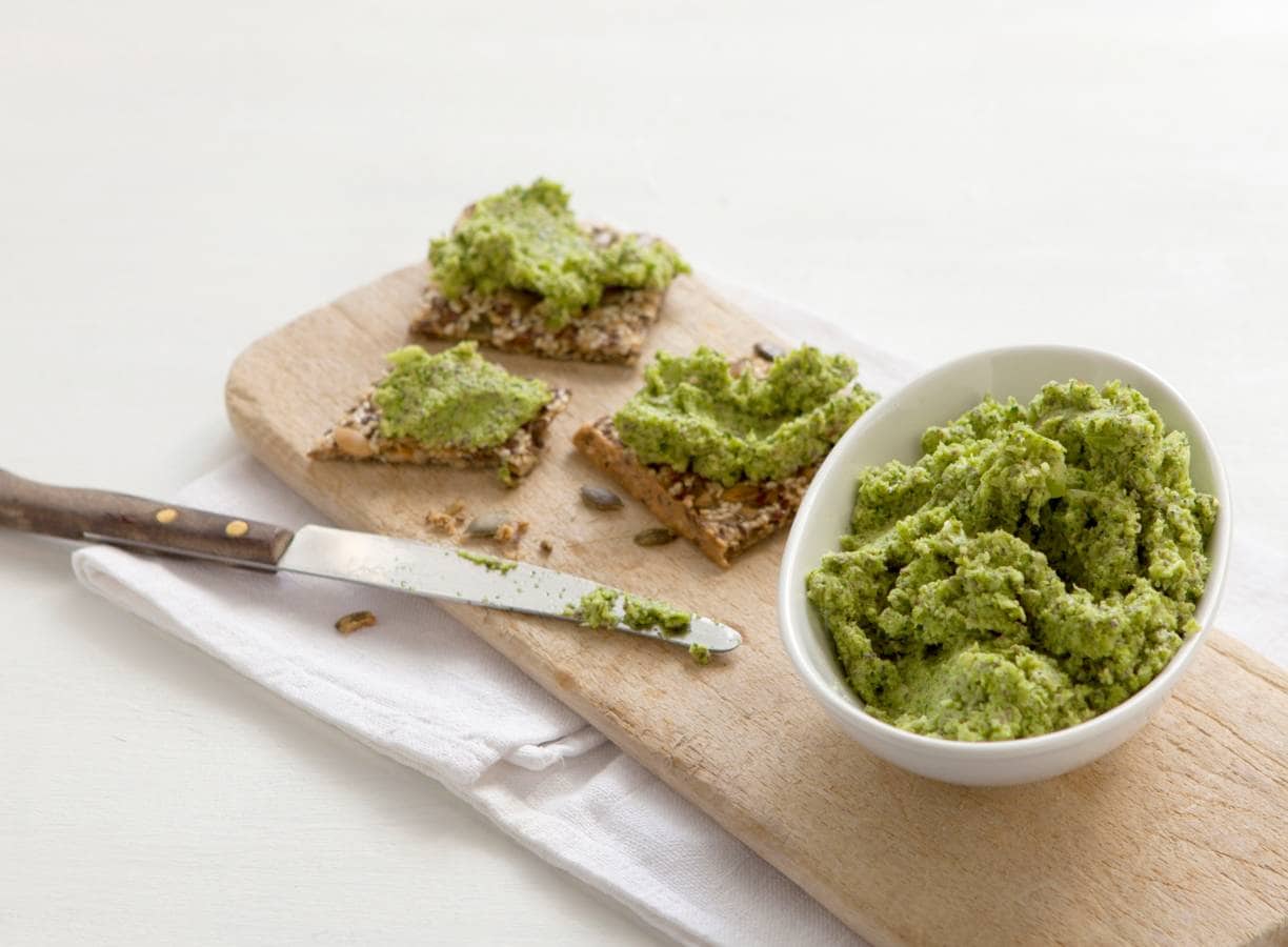 Gemaakt met rauwe broccoli. De noten geven de spread een knapperig accent en door de olie is-ie toch smeuïg.