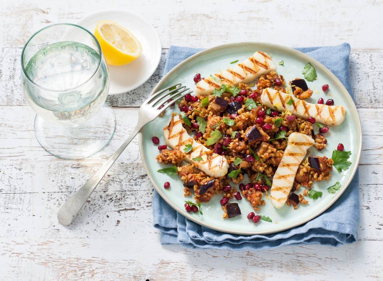 Oosterse salade met gegrilde halloumi en koriander. Perfect voor een dagje zonder vlees.