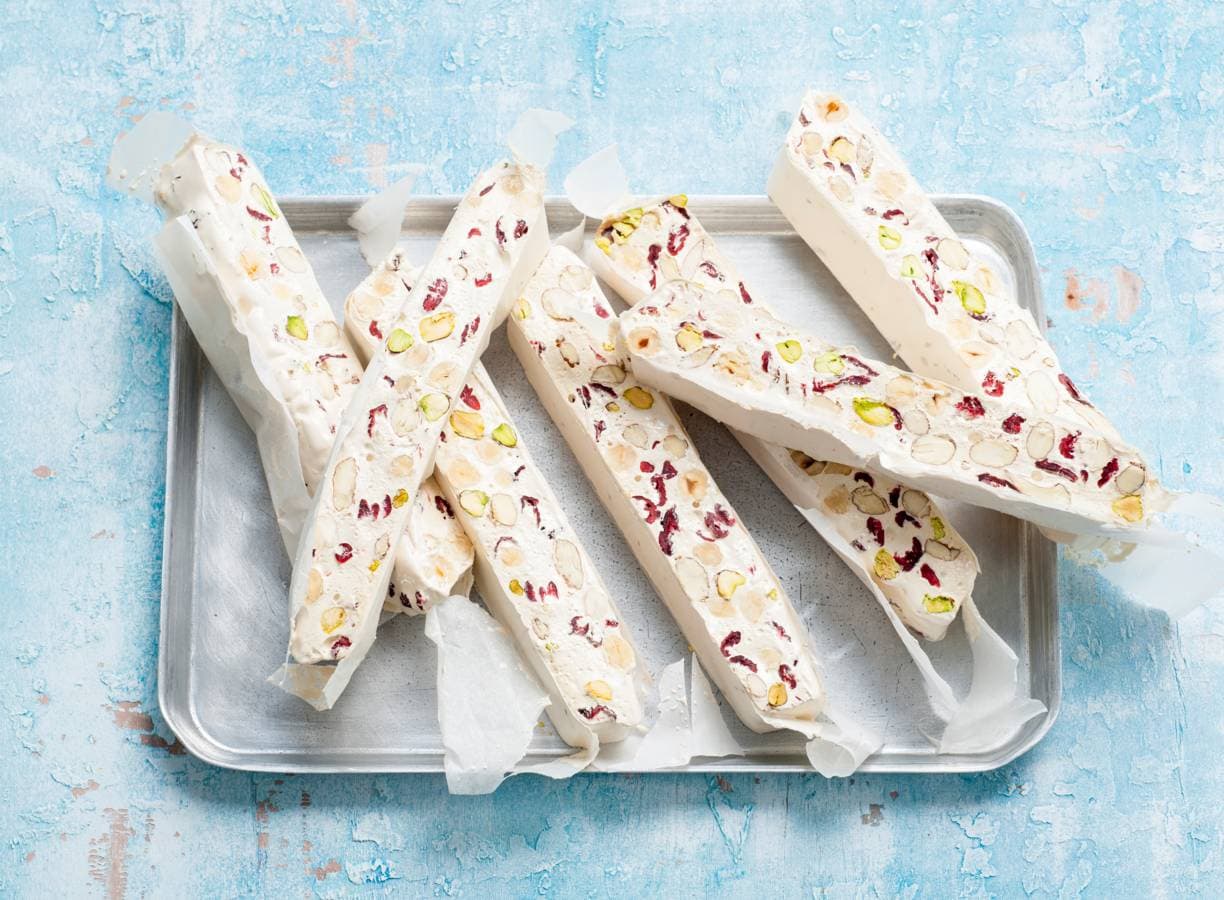 Blokjes nougat met hazelnoten, pistachenoten en gedroogde cranberry's.