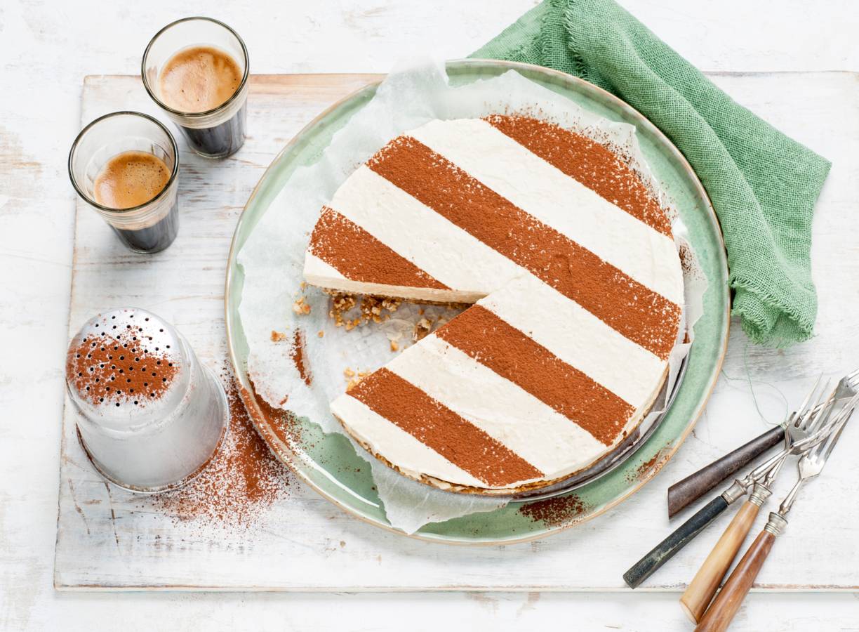 Snijd de taart rondom voorzichtig los van de springvorm en verwijder de ring van de springvorm. Knip 4 stroken bakpapier van 3 cm breed. Leg ze 3 cm uit elkaar op de taart. Bestuif de taart met behulp van een zeef met een dun laagje cacao en verwijder voorzichtig de stroken bakpapier. Zo ontstaat een mooi streeppatroon.