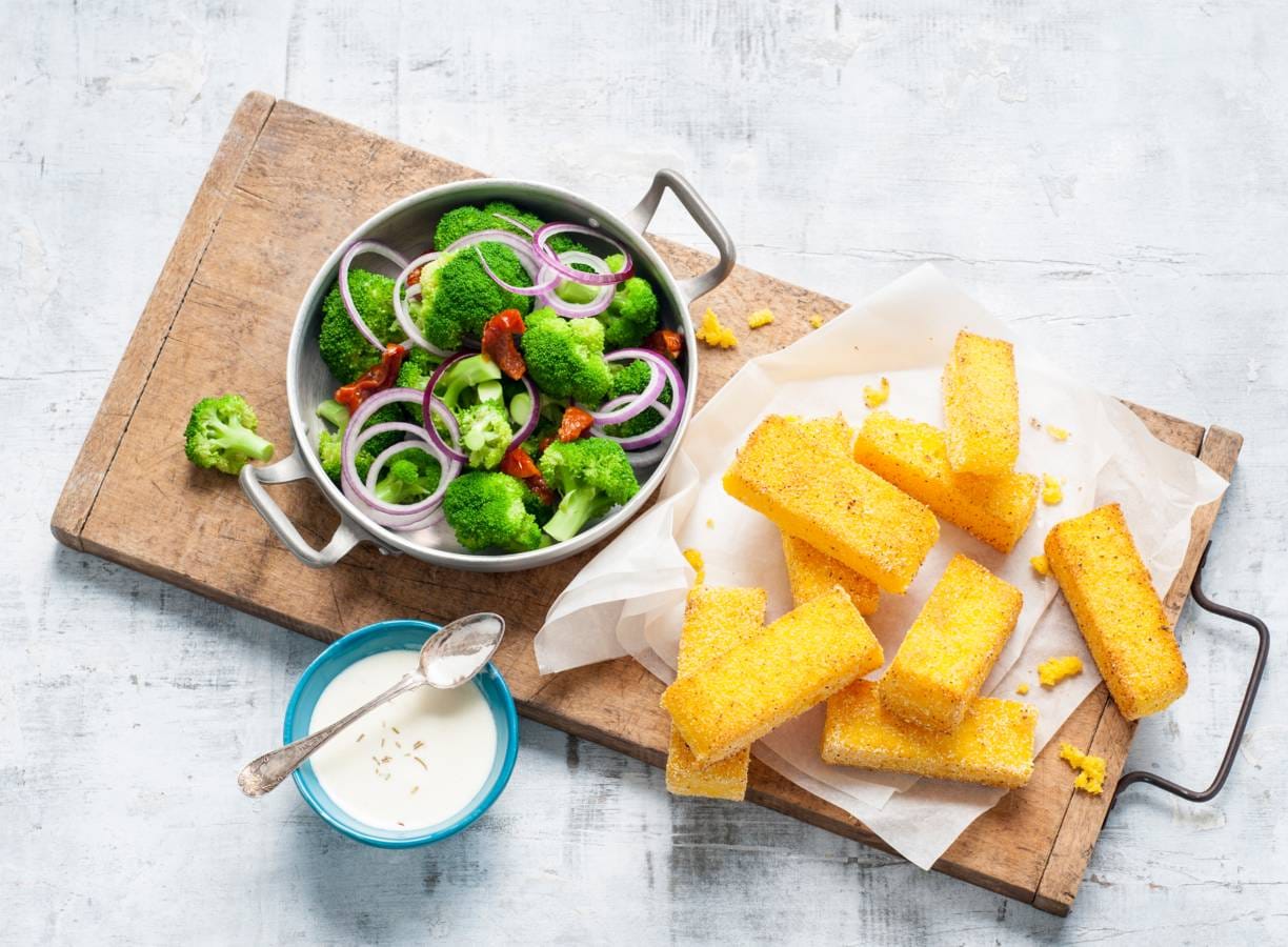 Snijd de polenta in langwerpige blokjes van ca. 2 x 6 cm en rol ze door de rest van de polenta. Verhit 1 cm olie in een koekenpan en bak de polenta in 4 min. op hoog vuur goudbruin en knapperig. Keer halverwege. Laat uitlekken op keukenpapier. Serveer de polentablokjes met de broccolisalade.