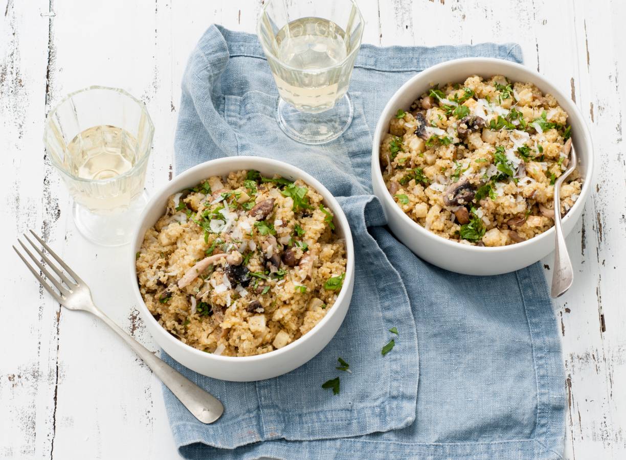 Voeg het paddenstoelen-knolselderijmengsel toe aan de quinotto en schep om. Snijd de peterselieblaadjes fijn. Verdeel de quinotto over de borden en bestrooi met de peterselie en de achtergehouden Parmezaanse kaas.