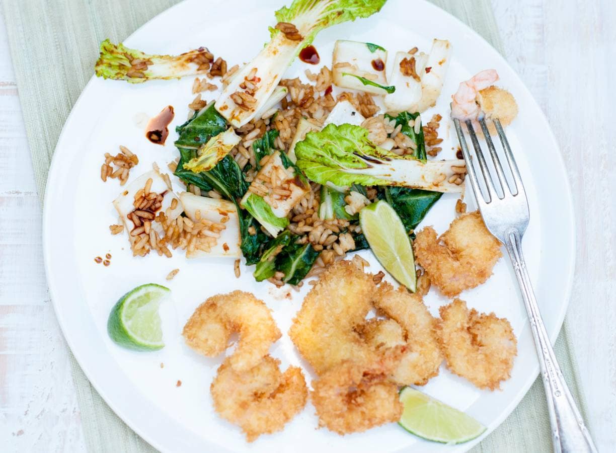 Serveer het rijst-paksoimengsel met de garnalen.