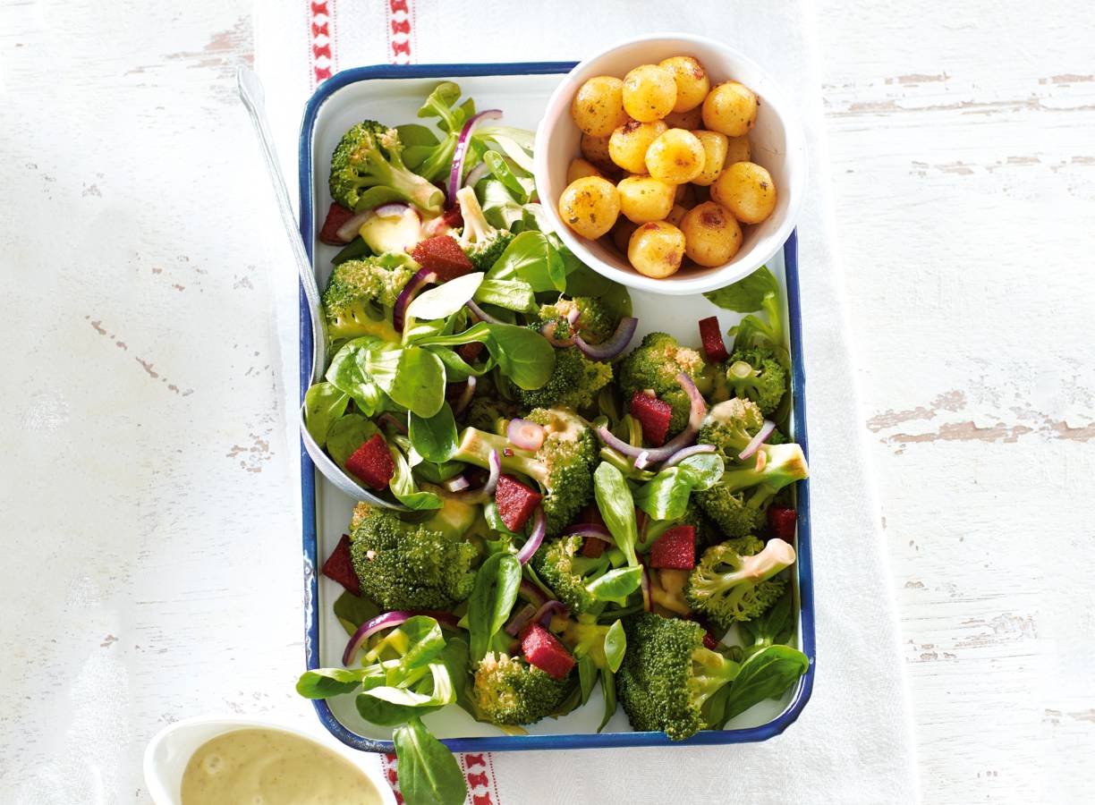 Fruit in het achtergebleven bakvet de ui en knoflook 1 min. Snijd de broccoli in roosjes, voeg toe aan het ui-knoflookmengsel en bak 6 min. op middelhoog vuur. Schep regelmatig om. Meng de veldsla en salami door de broccoli en schep op een grote platte schaal. Serveer de dressing en minikrieltjes erbij.