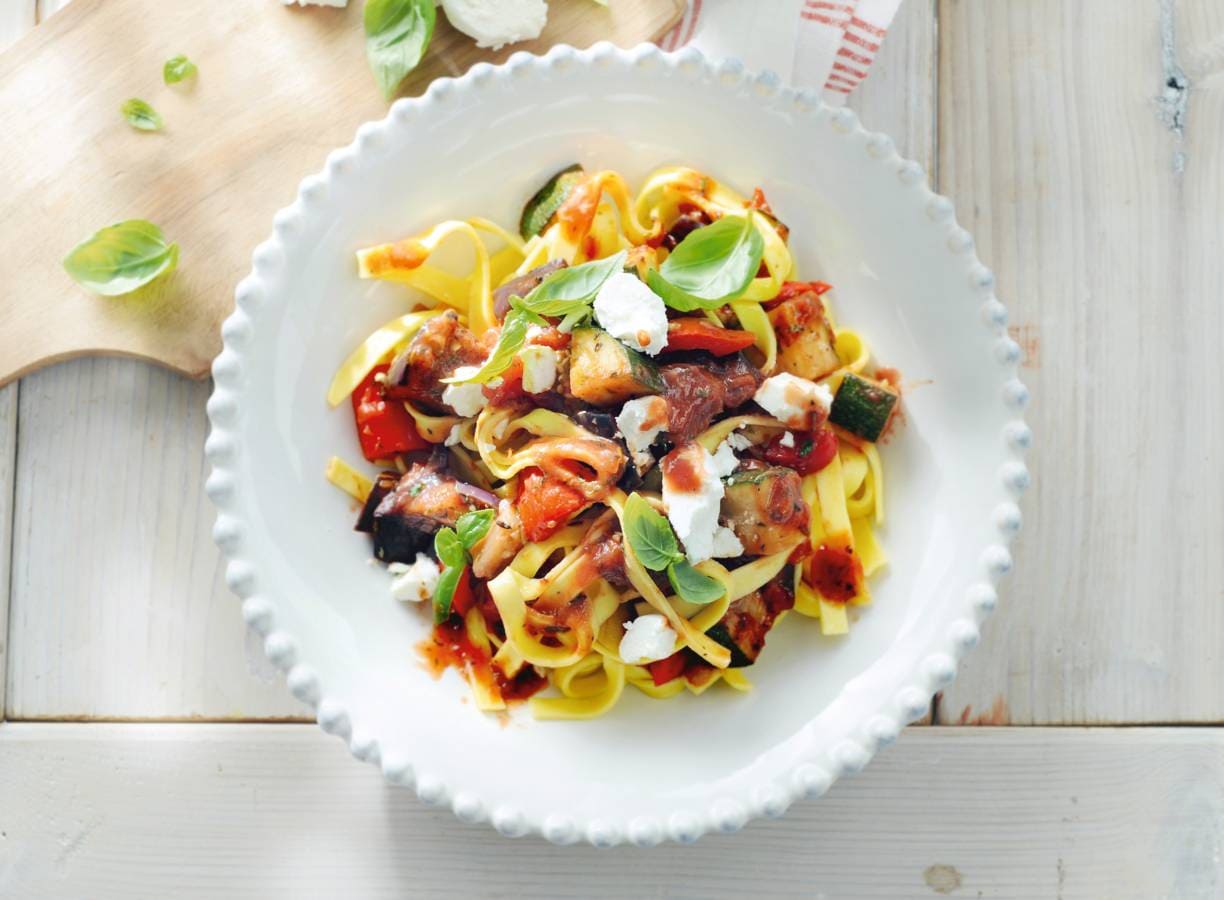 Kook ondertussen de pasta volgens de aanwijzingen op de verpakking. Giet de pasta af en schep door de ratatouille. Breng op smaak met (versgemalen) peper en eventueel zout. Verkruimel de geitenkaas boven de pasta en garneer met het basilicum.