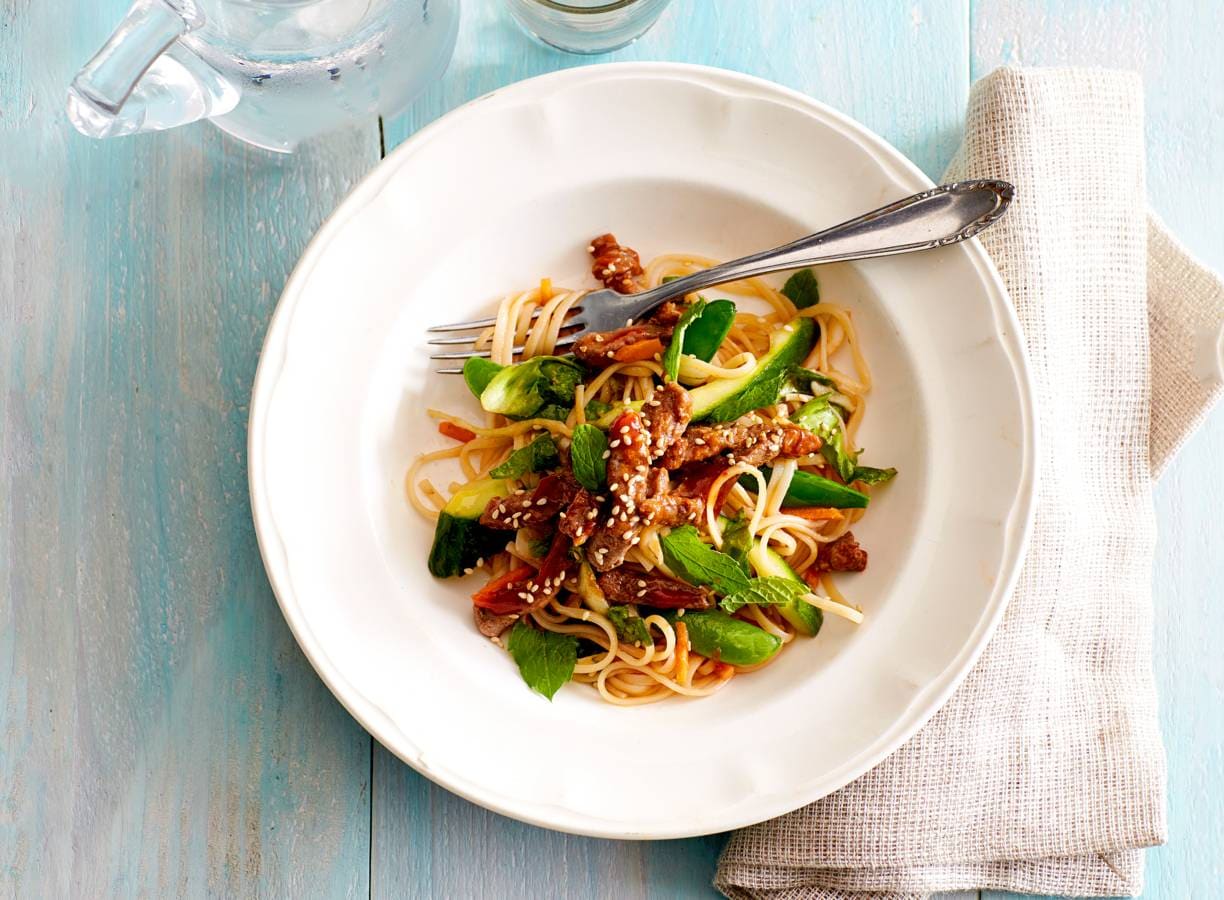 Schep de salademix, komkommer en dressing door de koude noedels en breng op smaak met peper en eventueel zout. Garneer met de runderreepjes.