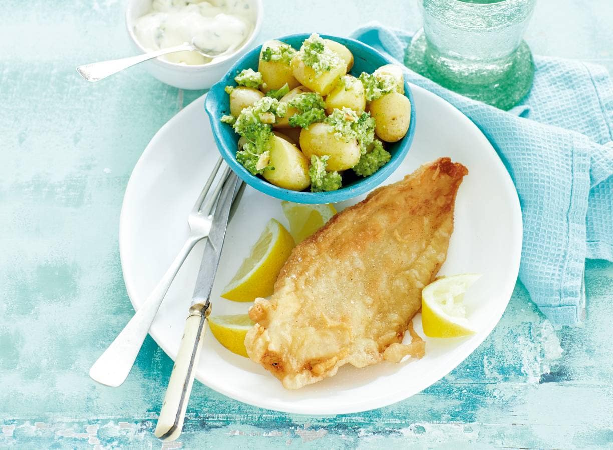 Haal de scholfilets met een schuimspaan uit de pan en laat ze uitlekken op keukenpapier. Verdeel de lekkerbekjes met de krieltjessalade.