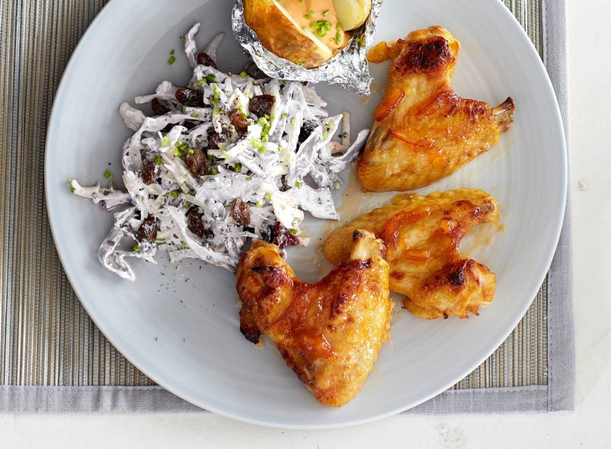 Dagje USA: kippenvleugels en gepofte aardappel. De coleslaw maakt het compleet.