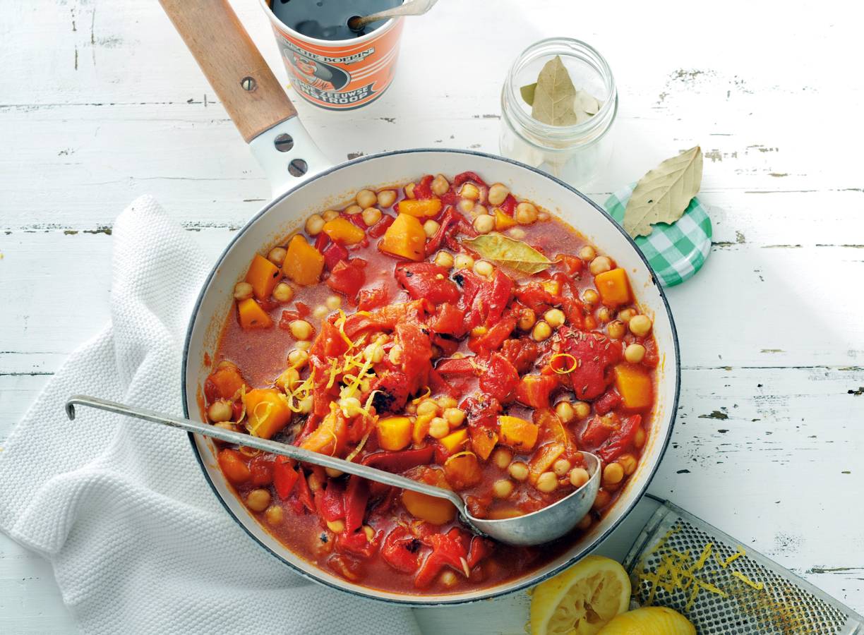Snijd de knoflook fijn. Verhit de olie in een hapjespan en fruit de knoflook 1 min. Voeg de pompoen, het karwijzaad, de paprika, 1,5 el citroensap, het laurierblaadje, stroop, tomatenblokjes en kikkererwten toe. Breng op smaak met peper en eventueel zout en breng aan de kook. Draai het vuur laag, doe de deksel schuin op de pan en stoof het mengsel in 25 min. gaar. Schep regelmatig om. Neem de pan van het vuur, verwijder de laurier en roer de helft van het citroenrasp erdoor.