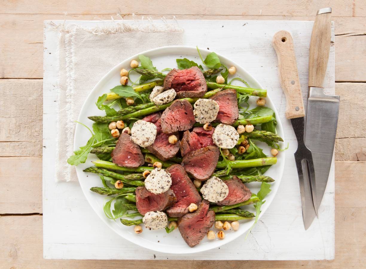 Ossenhaas met truffelboter, groene asperges en hazelnoten
