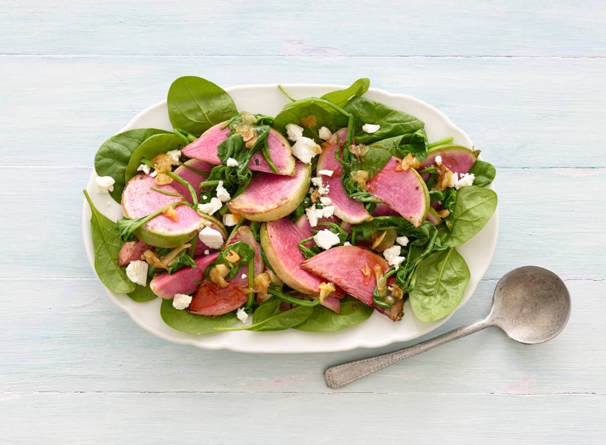Meng ondertussen de sushi gember, sojasaus, honing en het citroensap en roer door de watermeloen. Voeg de helft van de spinazie toe en laat al omscheppend slinken. Verdeel de rest van de spinazie over een platte schaal. Verdeel het watermeloen-spinaziemengsel over de spinazie op de schaal, verkruimel de feta erover en serveer.
