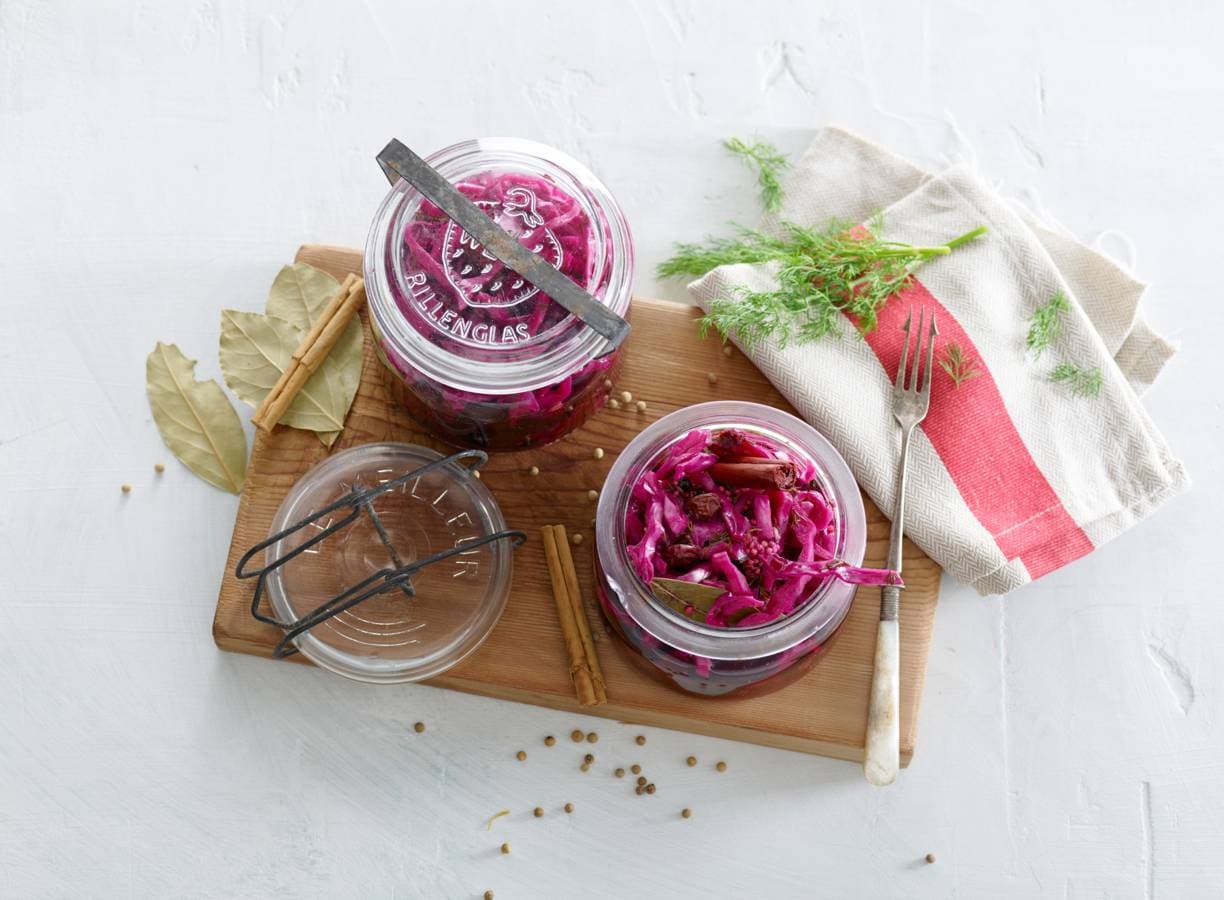Verwijder de harde kern van de rodekool en snijd in repen van ½ cm. Snijd de dille fijn. Doe de kool en dille samen met de rozijnen en kaneelstokjes in de weckpot.