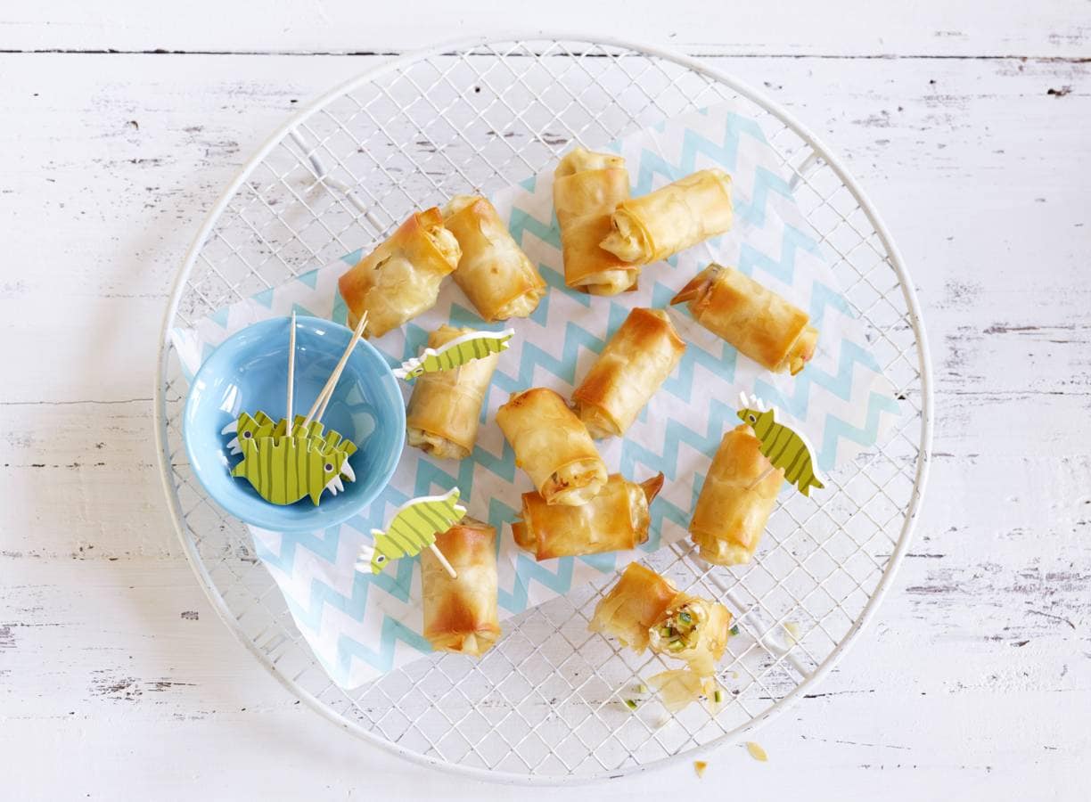 Bestrijk de randen van een reep deeg dun met wat olie. Schep op een smalle kant van een reep 1 el van het courgettemengsel. Vouw de zijkanten over de vulling en rol de reep deeg op. Plak de rand met een beetje olie dicht. Maak zo ook de rest van de rolletjes.