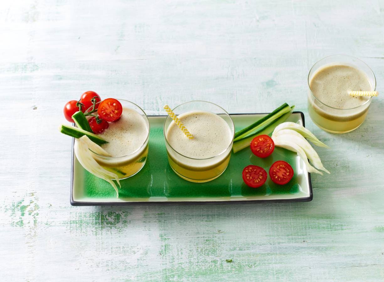 Snijd de komkommer in stukken. Snijd de venkelknollen en appels in parten. Haal de tomaten v/d tak.