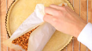 Prik met een vork gaatjes in de bodem en leg er een stuk bakpapier op. Vul de vorm met de blindbakvulling.