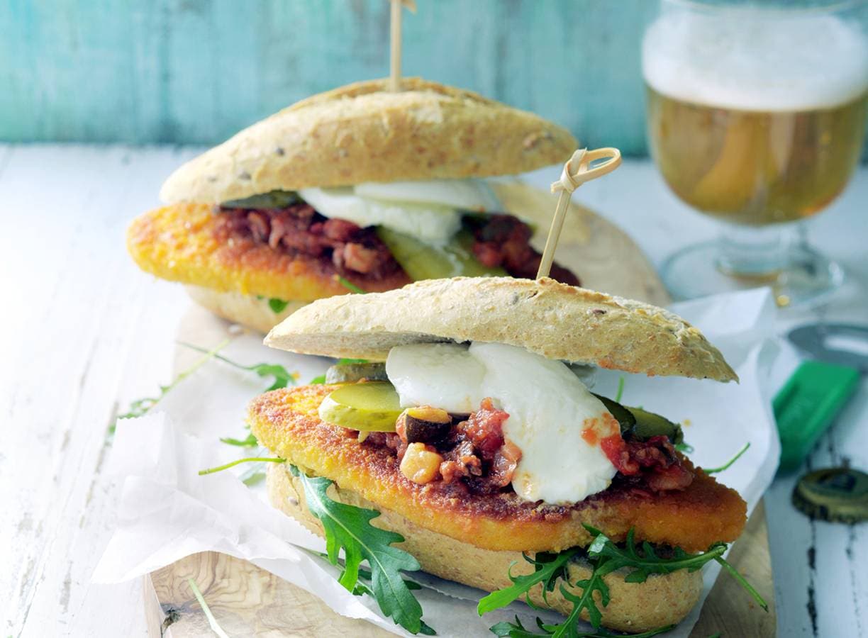 Verhit ondertussen de olie in een koekenpan en bak de schnitzels in 5 min. goudbruin en gaar. Keer regelmatig. Laat uitlekken op keukenpapier. Snijd de mozzarella in plakjes. Snijd de broodjes open. Leg de rucola en schnitzels erop.