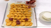 - Rol het bladerdeeg met een deegroller extra uit op een met bakpapier beklede bakplaat. Verdeel de aardappelplakjes dakpansgewijs over het bladerdeeg en verdeel de tomaatjes over de aardappelplakjes. Verkruimel de geitenkaas erboven.