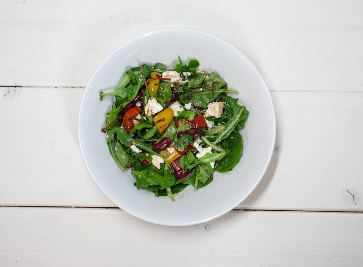Pak een schaal en doe hier de jonge bladsla met babyspinazie in. Voeg vervolgens de gegrilde paprikamix en de kidneybonen toe. Maak de salade af door de verse geitenkaas erover te verdelen. Besprenkel met de balsamicodressing. En voilà, de geitenkaassalade is klaar!