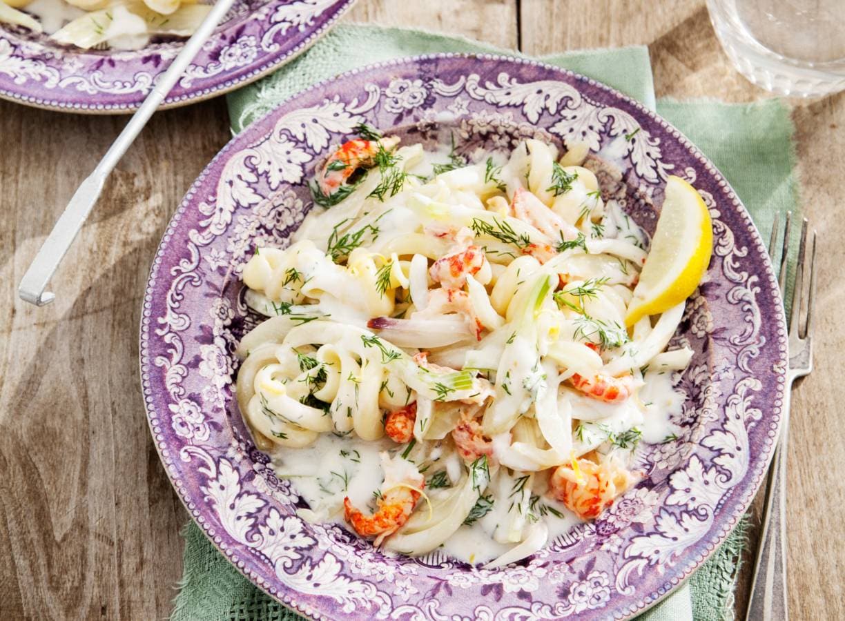 Giet de pasta af en meng met de dille en rivierkreeftjes door de venkel. Garneer met de citroenpartjes en serveer direct.