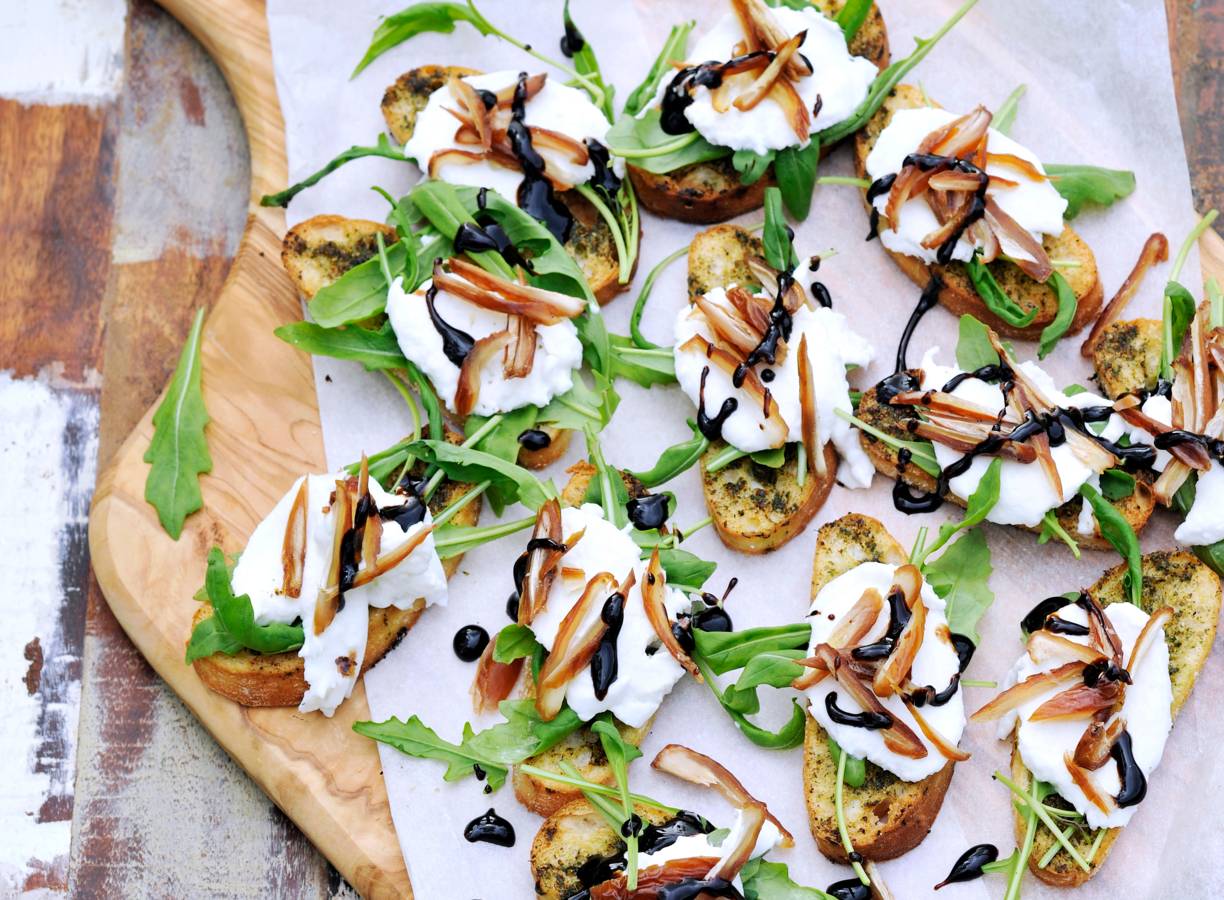 Verdeel de rucola over de bruschette en beleg ze met de plakjes mozzarella. Verdeel de cremaceto en dadels erover.