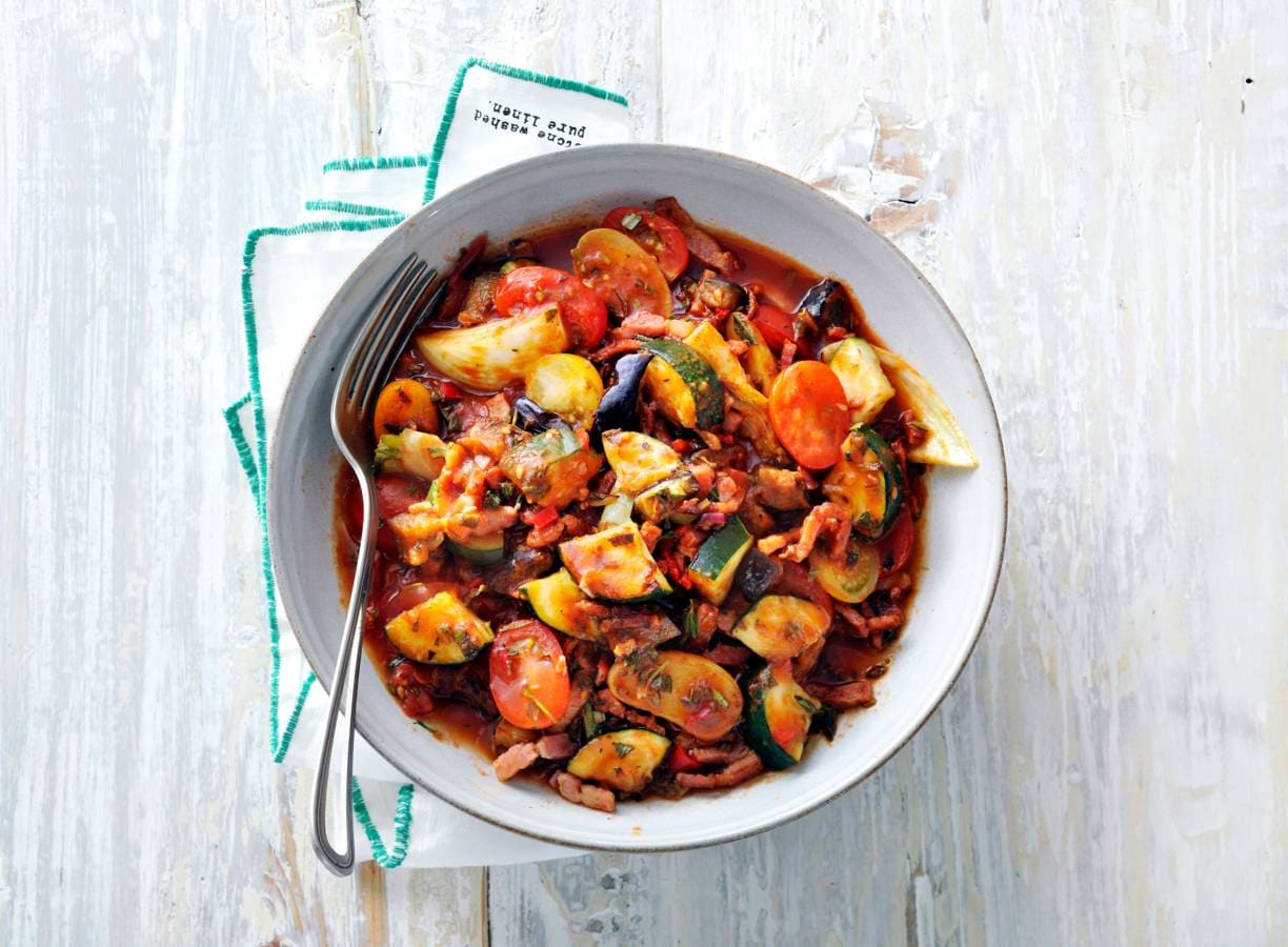 Heerlijk eenpansgerecht met stevige smaken, die elkaar versterken doordat je alle ingrediënten een halfuurtje laat stoven
