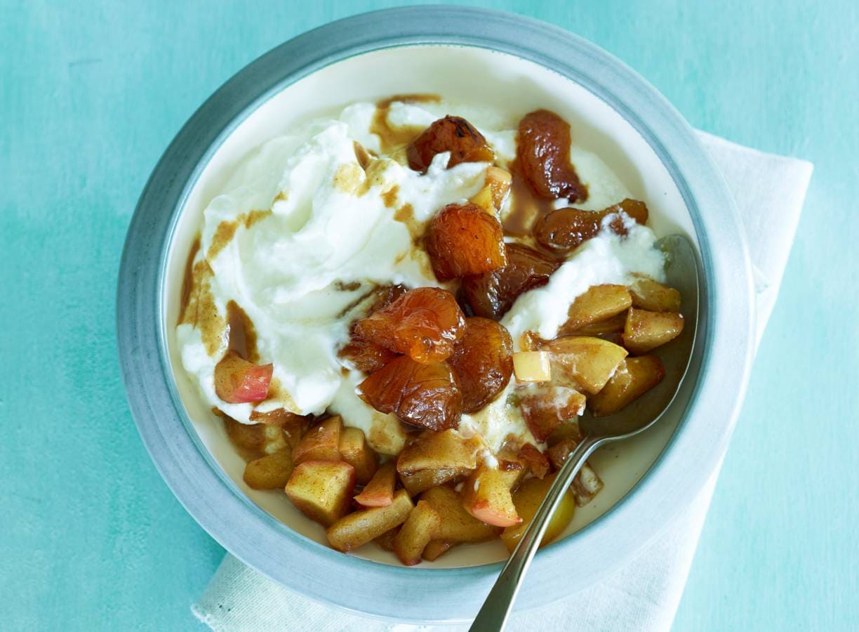 Smelt de boter in een pan met dikke bodem en stoof het appelmengsel 10-15 min. op laag vuur met de deksel op de pan. Roer regelmatig. Verdeel ondertussen de yoghurt over 4 glazen of kommetjes.