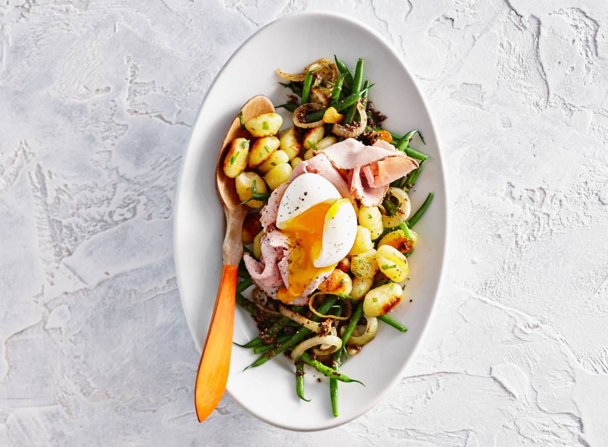 Meng de tapenade door de haricots verts en verdeel over 4 borden. Schep de gnocchi erop en verdeel de fricandeau erover. Leg de eieren erop en snijd deze in, zodat het eigeel eruit loopt. Bestrooi met peper.