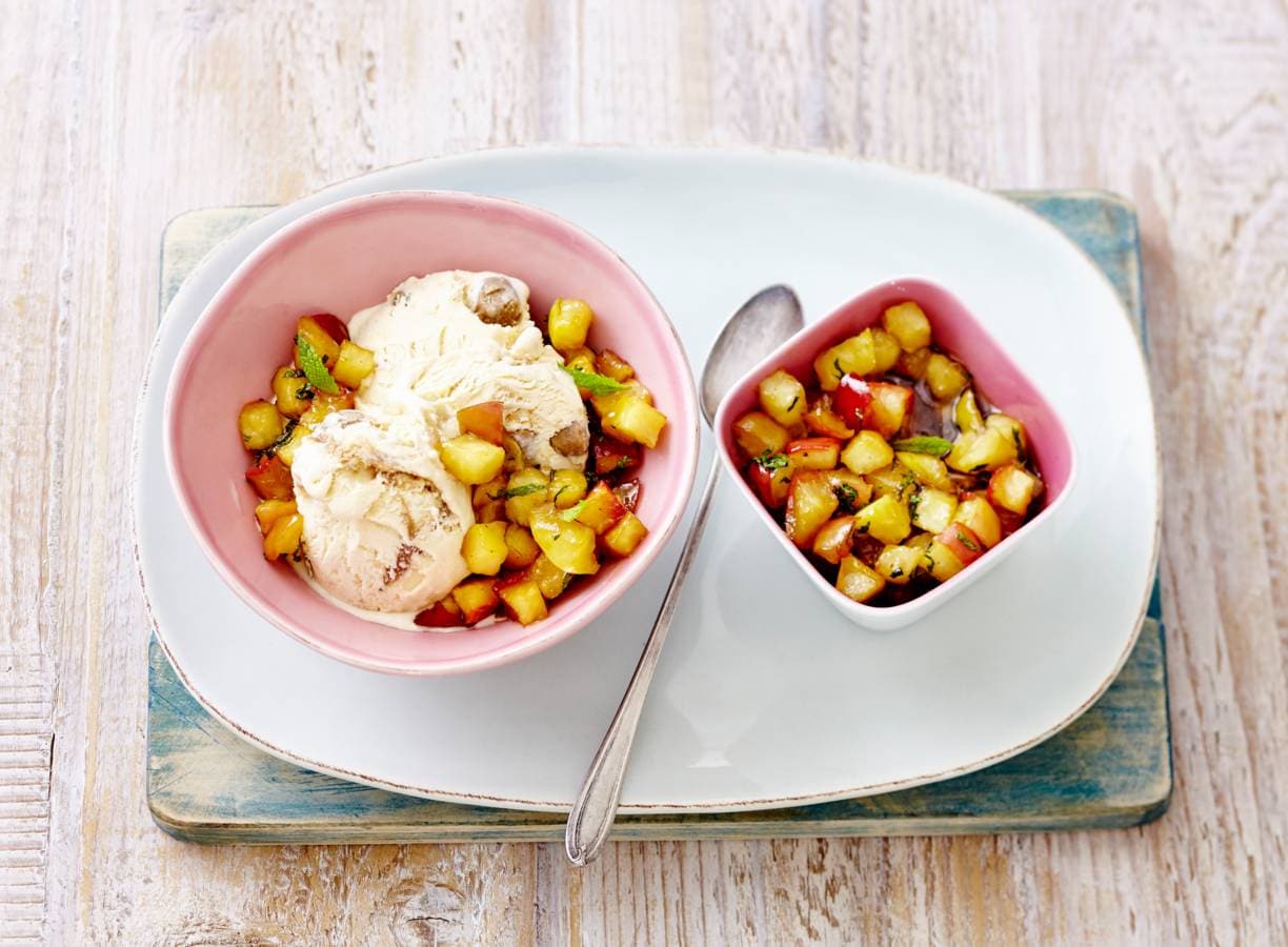 Snijd de appels in kwarten, verwijder het klokhuis en snijd ze in blokjes van 1 cm. Haal de blaadjes van de takjes munt en snijd ze grof. Verhit 2 el boter in een ruime koekenpan en bak de appel 2 min. op hoog vuur. Voeg 4 el bloemenhoning toe en bak nog 6 min. tot de honing karamelliseert. Roer de gesneden munt erdoor en serveer de appel met een flinke schep ijs. Snijd de blaadjes van 2 takjes munt grof en garneer.