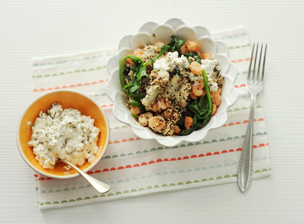 Neem de pan met knolselderij van het vuur en pureer de knolselderij en melk met een staafmixer tot een gladde puree. Breng op smaak met peper en zout. Meng de salie door de hüttenkäse. Roer de knolselderijpuree, spinazie en garnalen door de quinoa en verdeel de hüttenkäse erover.