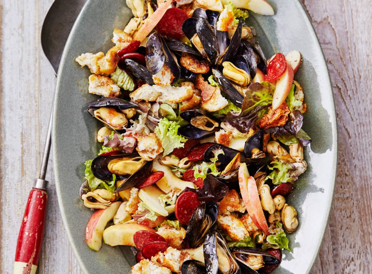 Meng in een ruime schaal de sla, chorizo, appel en het mosselvlees met de dressing. Verdeel de croutons en de rest van de mosselen in de schelp erover.