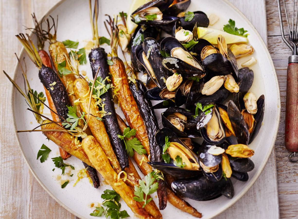 Mosselen in sherry met geroosterde wortel