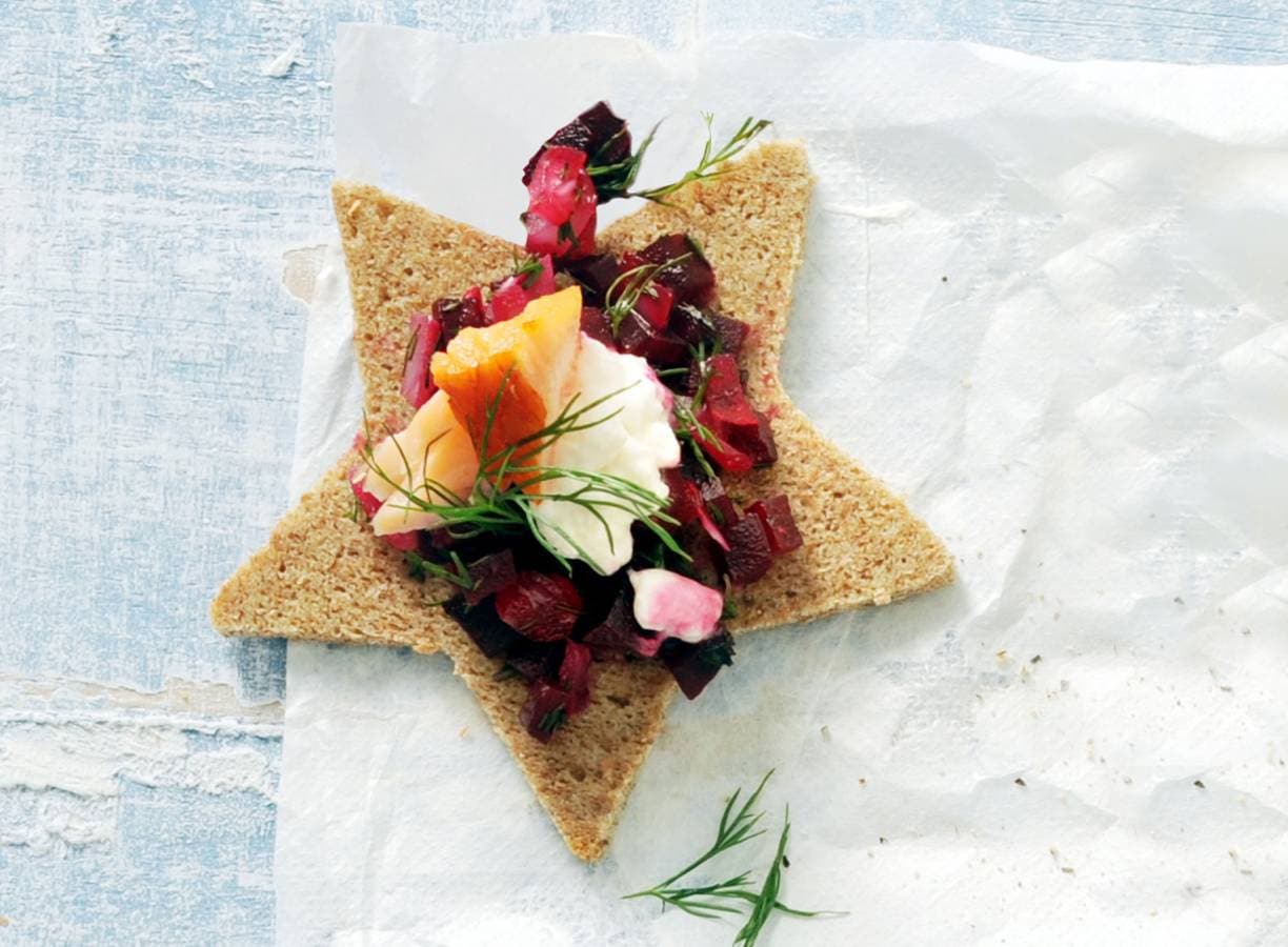 Snijd de rode biet in kleine blokjes en snijd 2/3 van de dille fijn. Meng de rode biet met de gesnipperde rode uitjes en dille. Laat 1 uur staan. Steek ondertussen met een steruitsteekvorm 15 sterren uit het roggebrood. Verdeel het biet-uimengsel, de hüttenkäse en warmgerookte zalm over de sterren. Garneer met een takje dille.