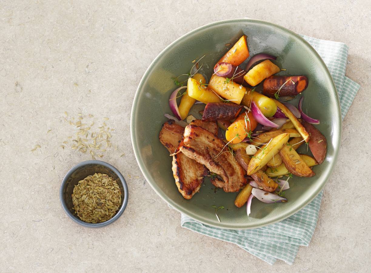 Regenboogwortels met aardappel en speklapjes uit de oven