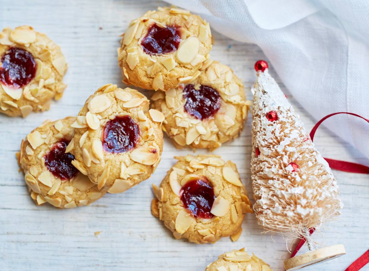 De kuiltjes in de koek (ja, die maak je echt met je duim!) worden klassiek gevuld met jam. Zo lekker in combinatie met de amandel.