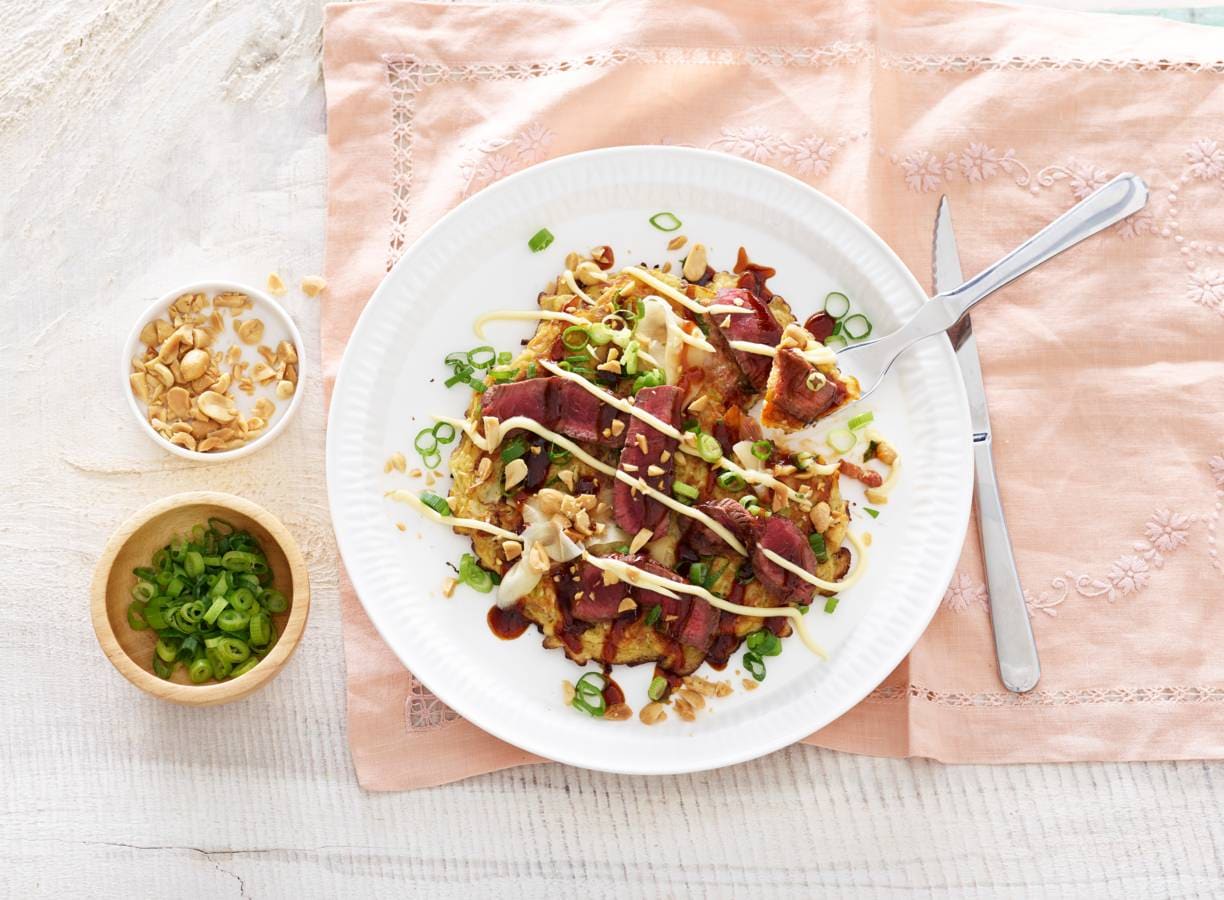 Een Japanse pannenkoek die je naar smaak kunt beleggen: okonomiyaki. Ga jij voor ossenhaas?