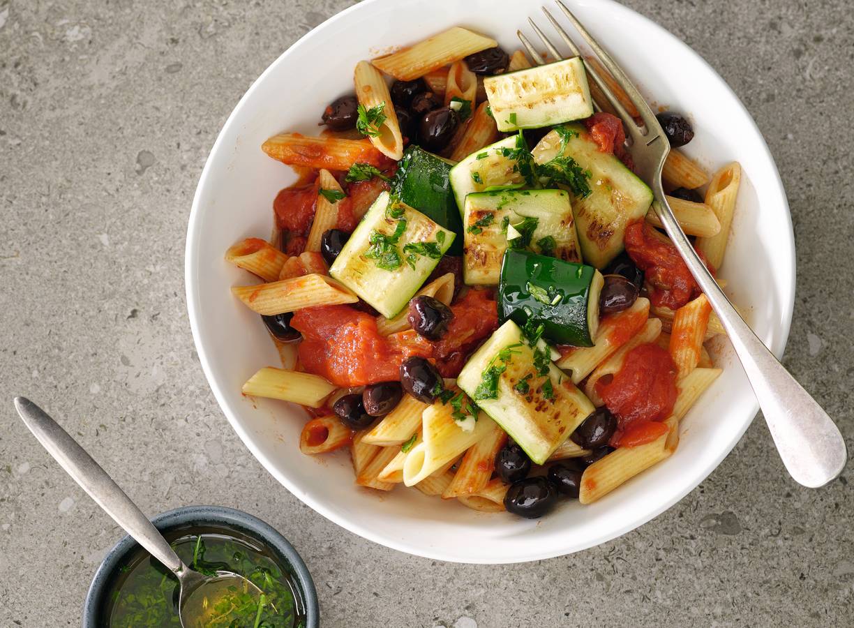 Neem de tomatensaus van het vuur en schep de pasta en de olijven erdoor. Verdeel over de borden en verdeel de courgette erover. Garneer met de gremolata.