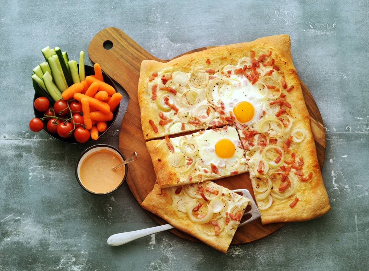 Dunne, knapperige deegbodem belegd met krokant spek en romig ei.