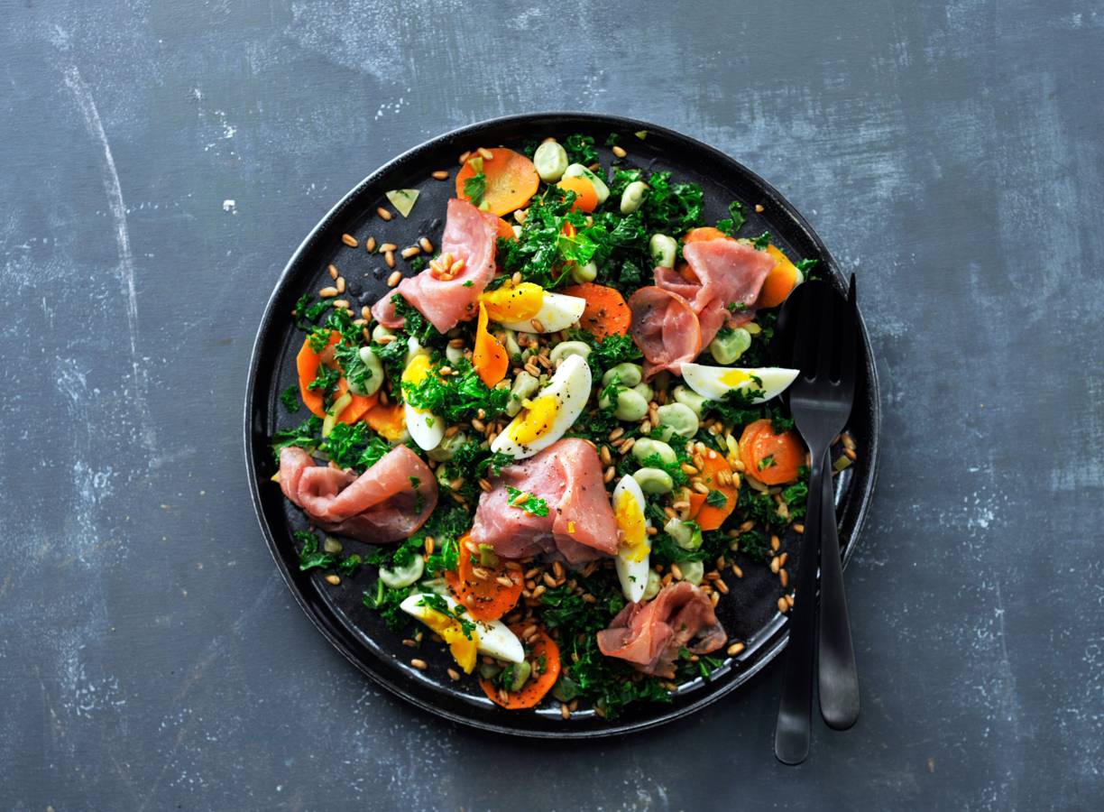 Spelt met tuinbonen, roerbakgroenten, rookvlees en ei