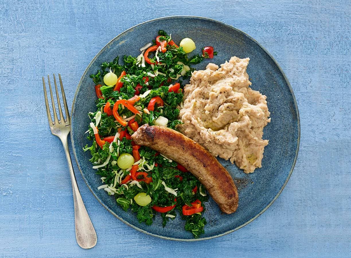 bereidingstip:Eten er kinderen mee? Maak voor hen van de witte-bonenpuree en de groenteroerbak een stamppot. Serveer de braadworst er los bij.