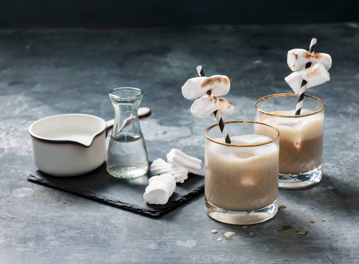 Verdeel de ijsklontjes en wodka over de glazen. Rijg aan elk satéstokje 2 marshmallows. Gril ze om en om 5 sec. boven het gasfornuis (of de barbecue) tot ze lichtgeblakerd zijn. Verdeel eerst de koffie en daarna de warme melk over de glazen en steek de satéprikkers met marshmallows erin. Serveer direct.
