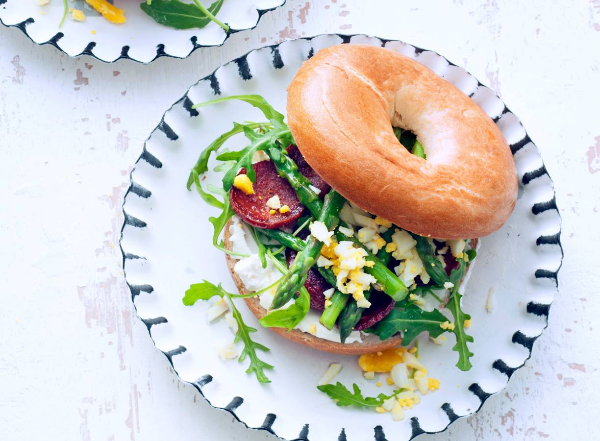Pittige Italiaanse pepperoni, romige ricotta en kruidige rucola. En dat allemaal op een knapperig afgebakken bagel. Goedemorgen!